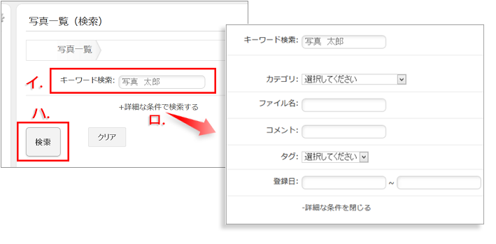 ロ. 「+詳細な条件で検索する」で、絞り込み検索を行うことができます。