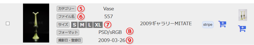 ⑧フォーマット・・・ファイルフォーマット(JPG,PSD,TIF,PDF,AIなど)と色空間(RGB/CMYK)が表示されます。