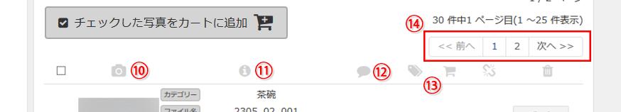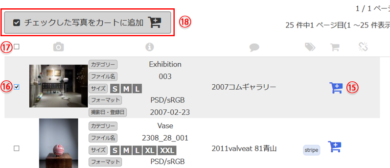 ダウンロードしたい写真や編集(カテゴリー・コメント・タグ・紐づき)したい写真、メールを送りたい写真、お気に入りに登録したい写真は、一旦カートに登録します。カートに登録するには、⑮カートボタン押す方法と、⑯⑰チェックをし⑱「チェックした写真をカートに追加」ボタンでまとめてカートに追加する方法の2パターンあります。