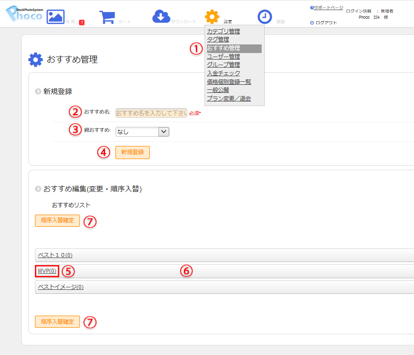 ⑤おすすめリストをクリックし、おすすめ名、親おすすめの変更、登録されている写真の削除を行います。