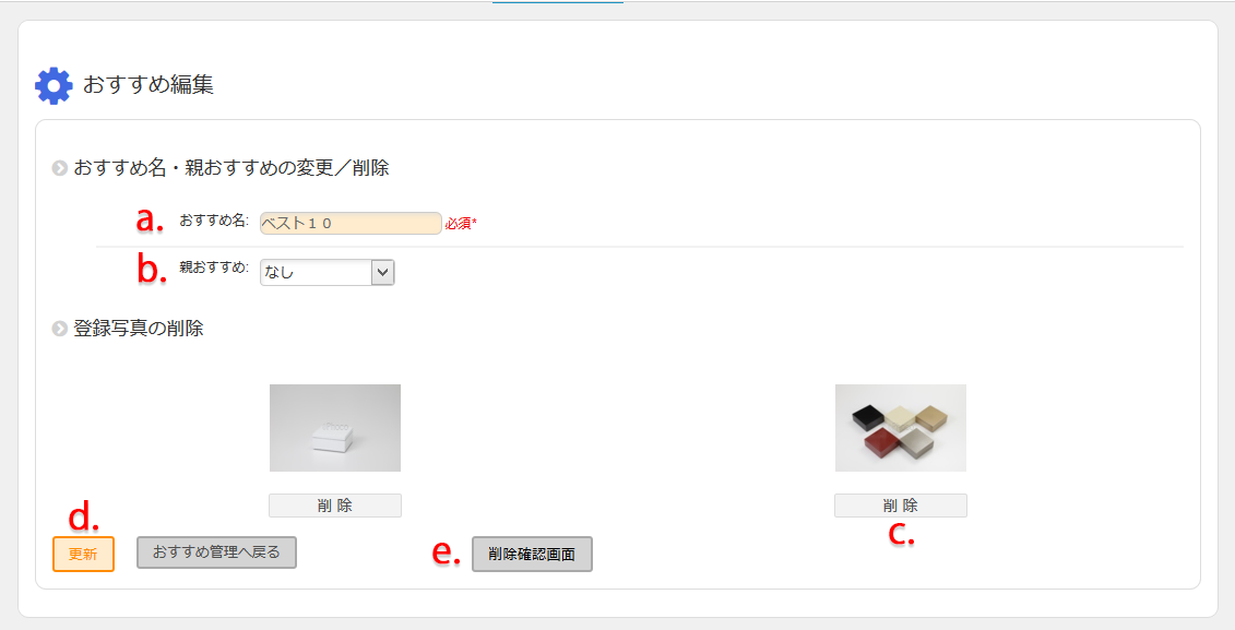 a. でおすすめ名を変更します。b. で親おすすめを変更します。おすすめに登録されている写真を削除したい場合は、c. の「削除」ボタンを押してください。d.「更新」ボタン を押して変更完了です。
