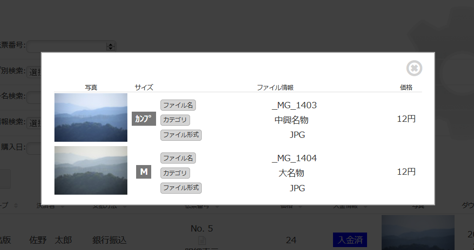 ユーザーが写真をPaypal決済で購入すると、入金管理画面に購入した写真が追加されます。即時決済の確認が取れるので、入金情報は「入金済」になり、ダウンロードが可能になります。※PAYPAL決済が何らかの要因で完了できない場合、「未入金」になりダウンロードできません。