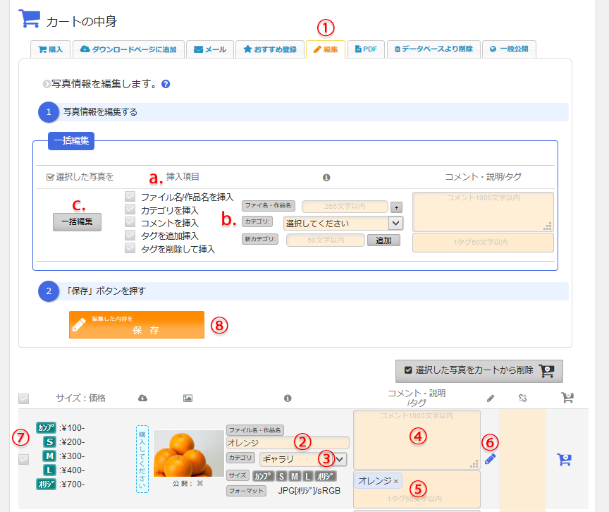 ①「編集タブ」を選択します。②ファイル名/作品名・③カテゴリ・④コメント・⑤タグ欄が入力待ち状態(アクティブ)になり、複数の写真が編集できるようになります。編集後、⑧「保存」ボタンを押して編集内容を保存します。⑧「保存」ボタンを押さないと保存されませんのでご注意ください。⑥ボタンで写真の差し替えや個別価格設定など詳細編集することも可能です(下【個別編集機能】参照)。