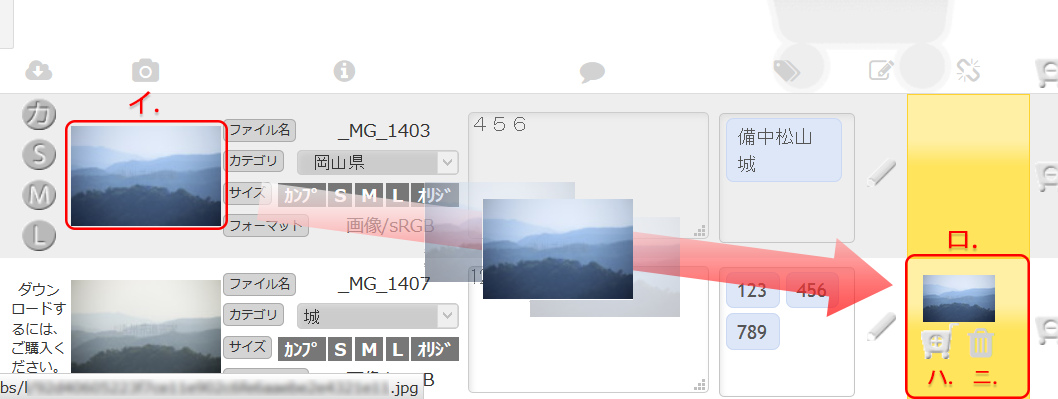 紐づけ機能は、関連性のある写真同士を紐づける機能です。 イ. 写真をロ. にドラッグ・アンド・ドロップすることで紐づけできます。同じ写真同士を紐づけることは出来ません。ハ. のカート追加ボタンで、紐づいいる写真をカートに追加できます。ニ. の削除ボタンで、紐づいている写真を削除できます。元の画像は削除されません。