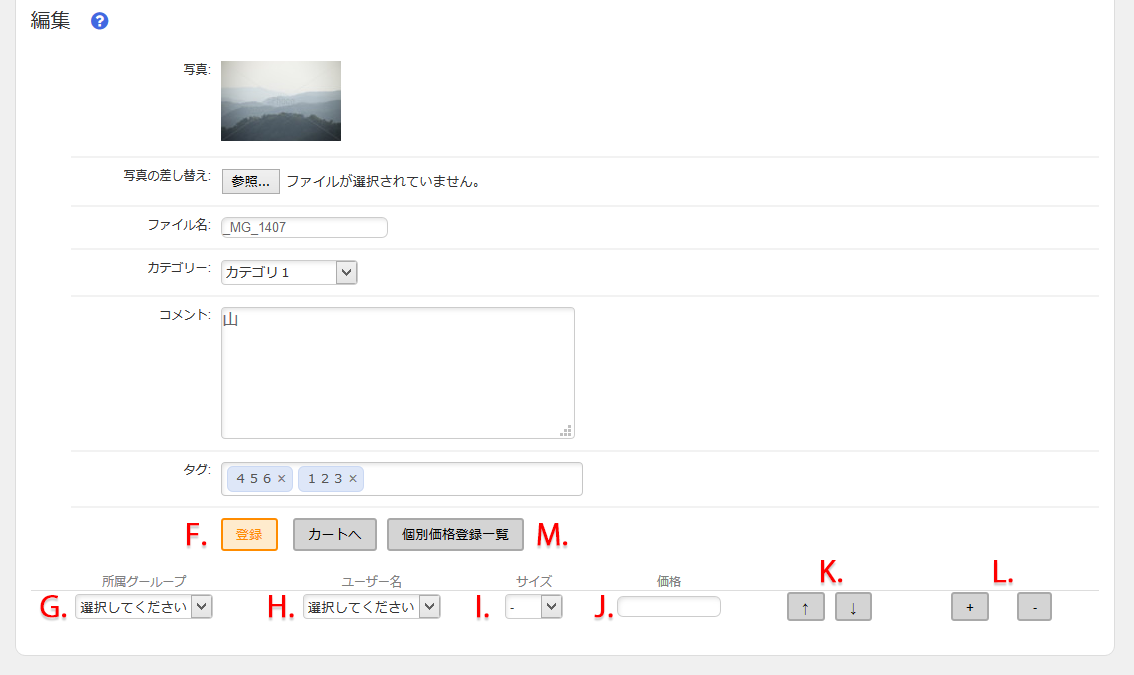 対象になるG. グループ、H. ユーザー、I. サイズを選択します。J. 価格を入力し、F. 登録ボタンを押して設定完了です。
