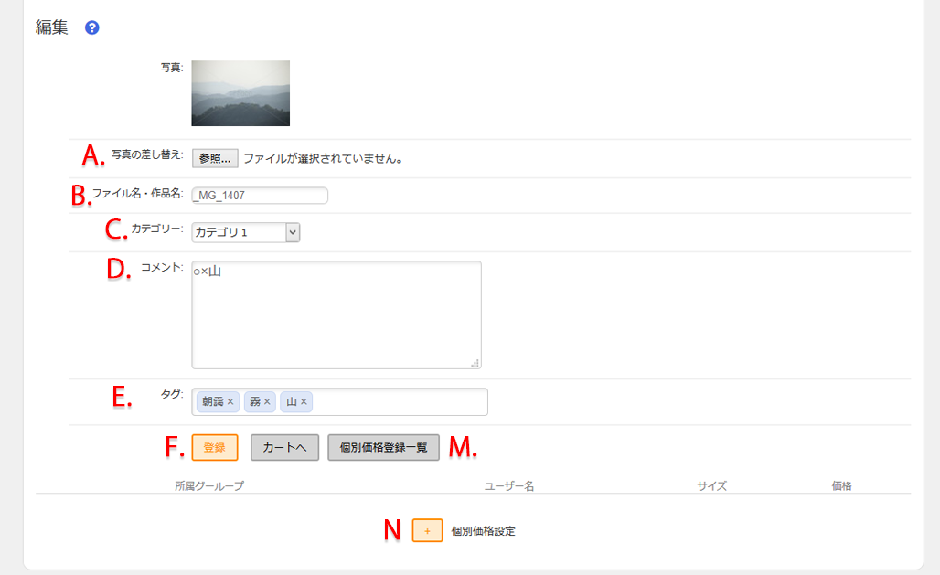 画像単位に価格が設定出来ます。N. 「個別価格設定」ボタンを押し、個別価格設定欄を表示させます。