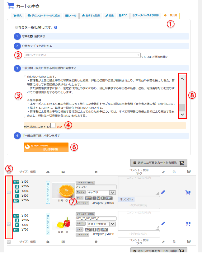 ①「一般公開」タブをクリックします。公開する②カテゴリを選択します(5つまで選択可能)。③「写真一般公開・販売に関する利用規約」を読み、⑧のスクロールバーを下げると④「利用規約に同意する」チェック項目がアクティブになります。利用規約に同意できる場合はチェックし、一般公開する写真を⑤チェックし、⑥「一般公開申請」ボタンを押します。