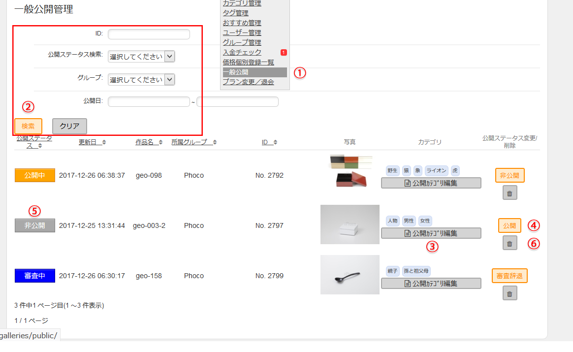 ⑤公開ステータス(公開/非公開/審査中/公開不可)