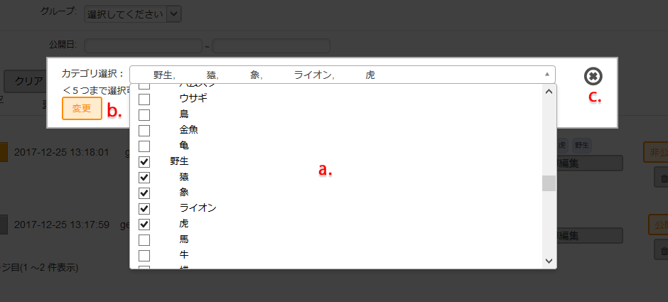 ③「公開カテゴリ編集」ボタンを押すと、公開カテゴリ編集ウィンドウが表示されます。a. 公開カテゴリを5つまで選択できます。