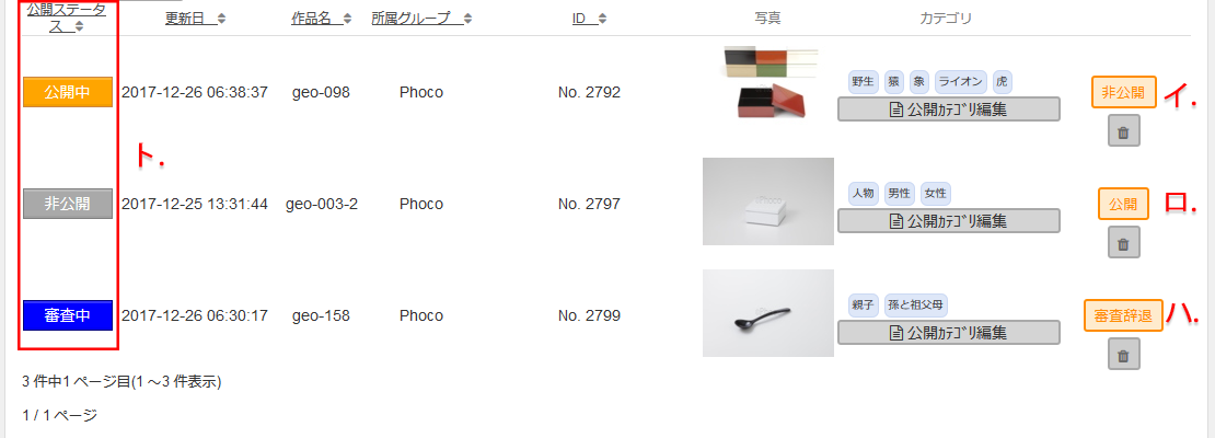 イ.ロ.ハ.「公開ステータス変更」ボタンを押して、ト.「公開ステータス」を変更することが出来ます。