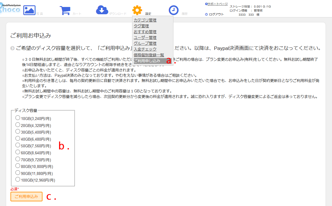 試用期間中、または試用期間が終わったお客様で継続してサービスをご利用希望の方は、 a. 「メニュー>設定>ご利用申込み」画面より、b. ディスク容量を選択して、c. 「ご利用申込み」ボタンを押します。以降は、Paypal決済画面にて決済をおこなってください。