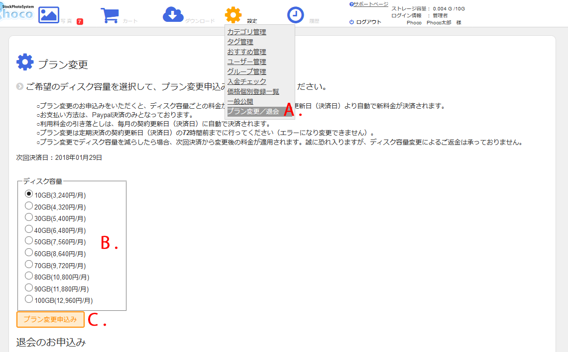 プラン変更をご希望の方は、A. 「メニュー>設定>プラン変更/退会」画面より、B. ディスク容量を選択して、C. 「プラン変更」ボタンを押します。