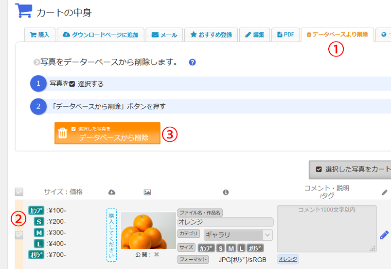 ①「データベースより削除」タブを押します。②削除したい写真をチェックします。③「削除」ボタンを押します。