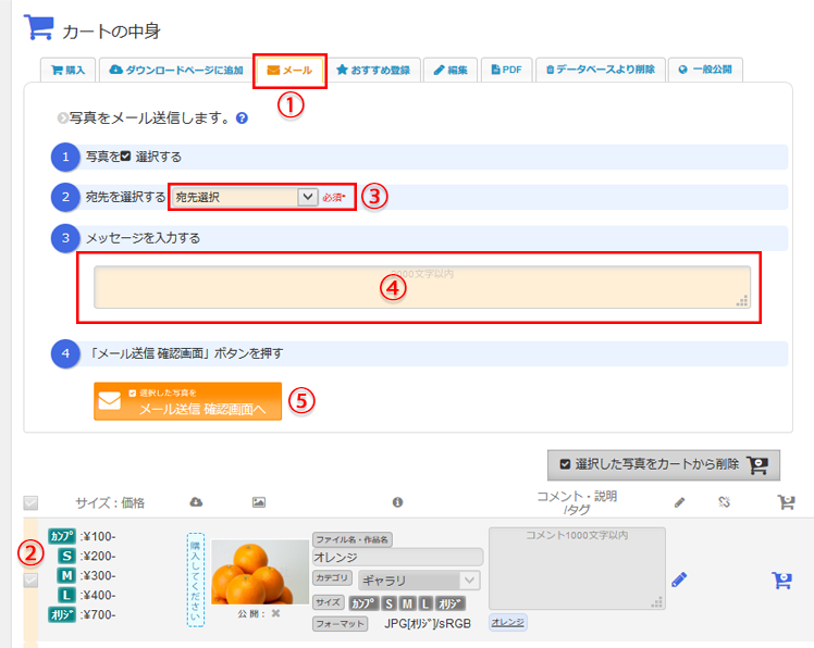 ①「メール送信」タブを選択します。メールを送りたい写真を選び②チェックし、③宛先を選び、④メッセージを入力します。⑤「メール送信 確認画面」ボタンを押し、確認画面に進みます。送信内容に間違いが無ければ、「送信」ボタンを押してメールを送信します。