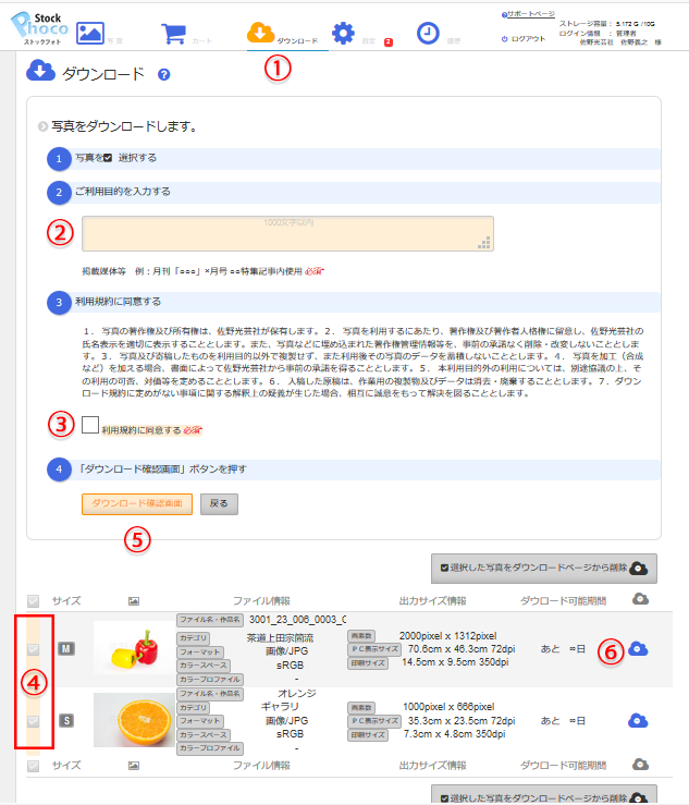 ①ダウンロードページを開きます。ダウンロードしたい写真を選び④チェックし、②ご利用目的を記入します。ご利用規約に同意する場合は③をチェックし、⑤「ダウンロード確認画面へ」ボタンを押し、確認画面へ進みます。