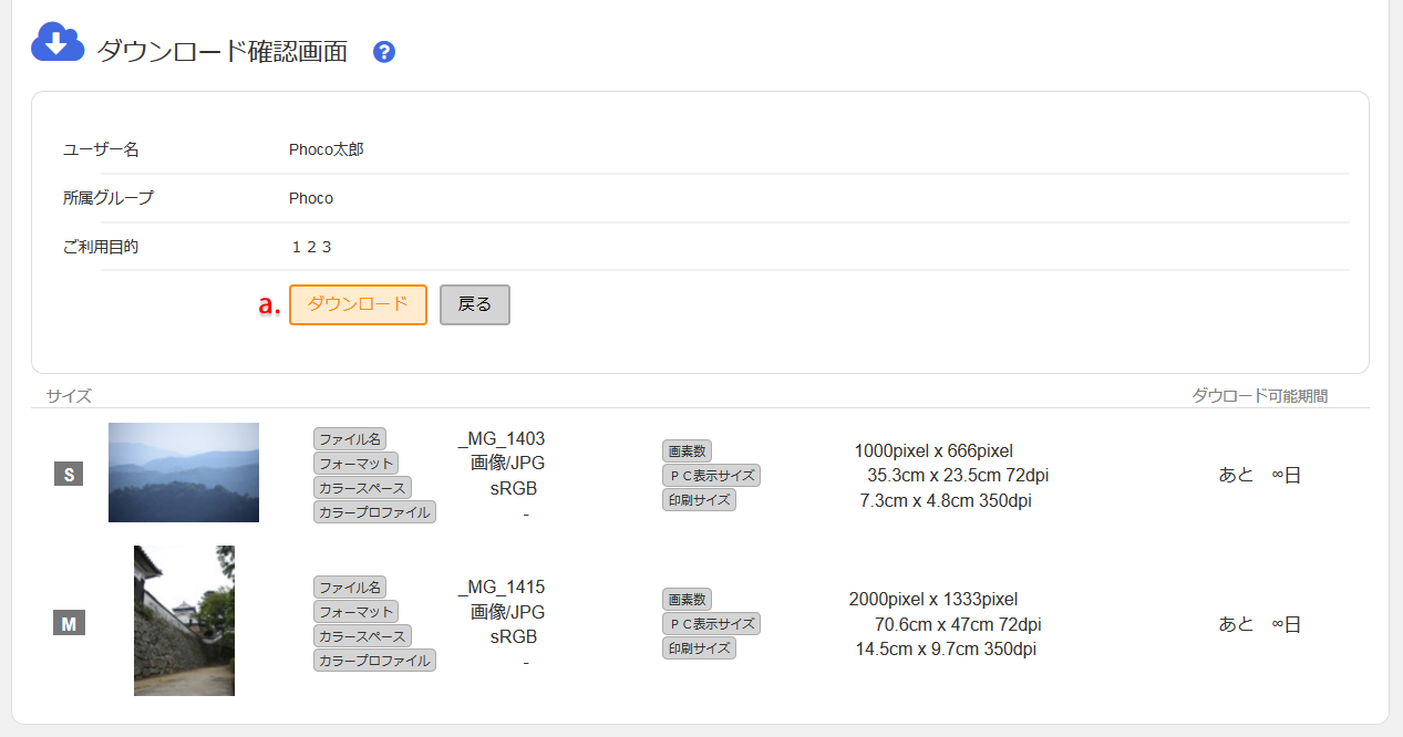 内容に間違いが無ければ、a. 「ダウンロード」ボタンを押すとダウンロードが始まります。ダウンロードファイルは、ZIP形式で圧縮されております。